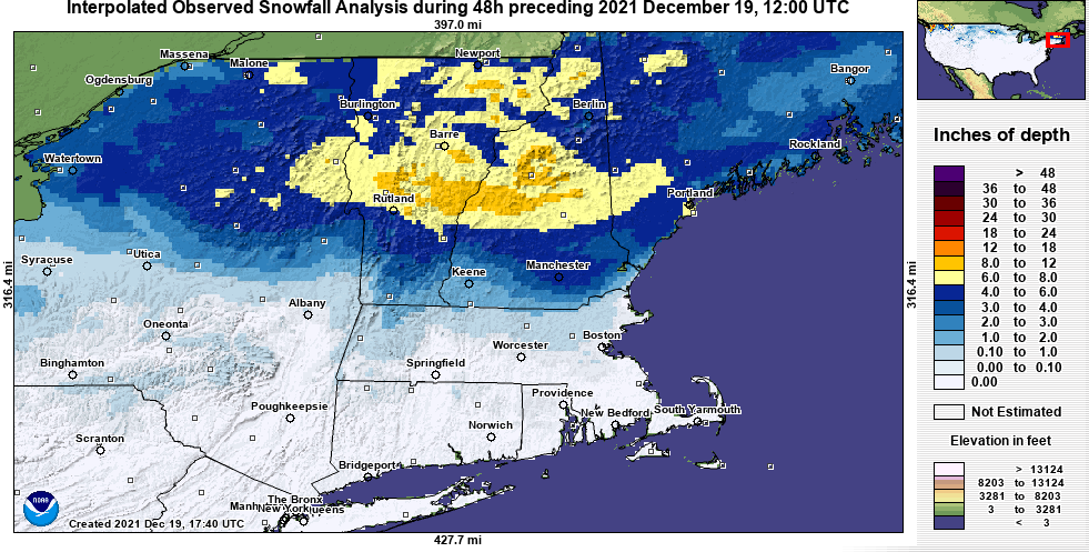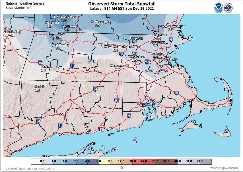 The trend in temperatures aloft toward a milder solution, related to yesterday’s weather system continued right through the time it arrived, which resulted in little snow accumulation in Connecticut and amounts in western Massachusetts that were a bit less than expected. Northern New England and northern New York were cold enough to pick up a significant accumulation.
